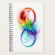 Artistically drawn infinity symbol with beautiful rainbow feather on white background. Tattoo style.