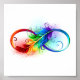 Artistically drawn infinity symbol with beautiful rainbow feather on white background. Tattoo style.