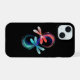 Infinity painted in neon, red and green paint, decorated with two luminous, contrasting dragonflies with glowing, transparent wings on black background. Glowing dragonfly.