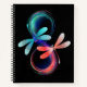 Infinity painted in neon, red and green paint, decorated with two luminous, contrasting dragonflies with glowing, transparent wings on black background. Glowing dragonfly.