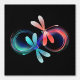 Infinity painted in neon, red and green paint, decorated with two luminous, contrasting dragonflies with glowing, transparent wings on black background. Glowing dragonfly.