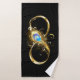 Gold, shiny symbol of infinity, decorated with jewellery peacock feather with turquoise on black background.