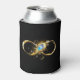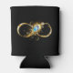 Gold, shiny symbol of infinity, decorated with jewellery peacock feather with turquoise on black background.