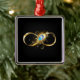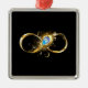 Gold, shiny symbol of infinity, decorated with jewellery peacock feather with turquoise on black background.