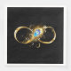 Gold, shiny symbol of infinity, decorated with jewellery peacock feather with turquoise on black background.