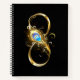 Gold, shiny symbol of infinity, decorated with jewellery peacock feather with turquoise on black background.
