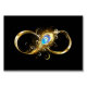 Gold, shiny symbol of infinity, decorated with jewellery peacock feather with turquoise on black background.