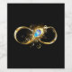 Gold, shiny symbol of infinity, decorated with jewellery peacock feather with turquoise on black background.