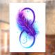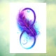 Infinity symbol with a beautiful feather painted in purple and blue bright colours on white background.
