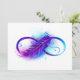 Infinity symbol with a beautiful feather painted in purple and blue bright colours on white background.