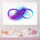 Infinity symbol with a beautiful feather painted in purple and blue bright colours on white background.