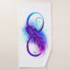 Infinity symbol with a beautiful feather painted in purple and blue bright colours on white background.
