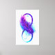 Infinity symbol with a beautiful feather painted in purple and blue bright colours on white background.