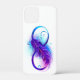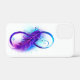 Infinity symbol with a beautiful feather painted in purple and blue bright colours on white background.