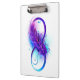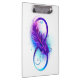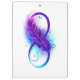 Infinity symbol with a beautiful feather painted in purple and blue bright colours on white background.