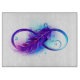 Infinity symbol with a beautiful feather painted in purple and blue bright colours on white background.