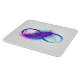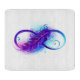 Infinity symbol with a beautiful feather painted in purple and blue bright colours on white background.