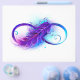 Infinity symbol with a beautiful feather painted in purple and blue bright colours on white background.