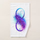 Infinity symbol with a beautiful feather painted in purple and blue bright colors on white background.