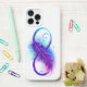 Infinity symbol with a beautiful feather painted in purple and blue bright colours on white background.