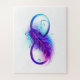 Infinity symbol with a beautiful feather painted in purple and blue bright colours on white background.