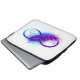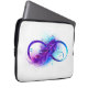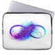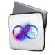 Infinity symbol with a beautiful feather painted in purple and blue bright colours on white background.
