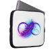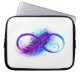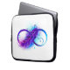 Infinity symbol with a beautiful feather painted in purple and blue bright colours on white background.