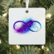 Infinity symbol with a beautiful feather painted in purple and blue bright colours on white background.