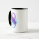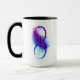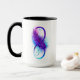 Infinity symbol with a beautiful feather painted in purple and blue bright colours on white background.