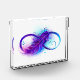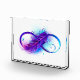 Infinity symbol with a beautiful feather painted in purple and blue bright colours on white background.