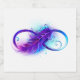 Infinity symbol with a beautiful feather painted in purple and blue bright colours on white background.