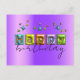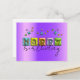 Unique personalised birthday postcard design featuring the text HAPPY written in a 3D inflated typography paired with a fully customisable hand written script and sparkles in matching colours on a purple metallic background.