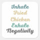 Sweet up your life and spread positivity with these "Inhale Fried Chicken Exhale Negativity" stickers! Featuring a bold, inspiring typography, these stickers are perfect for adding some personality to your notebook, laptop, water bottle, or anything in between. Each sticker is made from durable vinyl material and has a smooth, non-glossy finish that resists water, sunlight, and scratches, so you can enjoy them for years to come. Whether you're a fan of fried chicken or just want to remind yourself and others to let go of negativity, these stickers are a fun and uplifting addition to any collection.