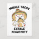 Cute design that shows a lovely cartoon cat wearing a sombrero hat and eating a mexican taco with the funny quote "Inhale tacos, exhale negativity. Tasty food makes you happy.