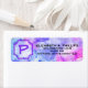 This label features a pastel watercolor splash of blue, purple, and pink with a placeholder for an initial letter monogram. The template information is on the right side of the label. Fill in the template text fields and initial letter with your information.