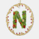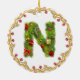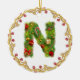initial N monogrammed christmas ornament - circle. This exquisite letter N christmas tree decoration will give your xmas a traditional touch with a modern personalised feel. Designed to look like a fir tree covered with presents and gifts this letter a on a circular ornament is surounded by a gold frame with red berries. Upmarket and on trend this is an affordable luxury for you holiday decor needs. Double sided for extra impact this green and red image on a snowy white background is a favourite with businesses also. Full alphabet available.