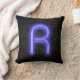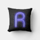 Initial R in glowing marquee purple neon lighting on urban city brick wall.