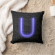 Initial U in glowing marquee purple neon lighting on urban city brick wall.