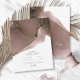 An abstract background reminiscent of liquid ink in shades from deep taupe through blush pink and white is the backdrop for elegant handwritten script text and modern design layouts in the pieces of this beautiful wedding suite. The wedding RSVP card shown here features the above and a template to add your own pertinent event information. Search ID762 to see all the coordinating pieces in this set.