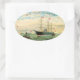 Vintage travel illustration promoting the Inman Steamship Company, showing an early steamship of a transitional design with sail rigging along with smokestacks.