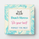 A cool inspirational saying which says: Don't Stress, Do your best, forget the rest. With a cute and happy smiling cat face. The background is a swirly paint marble texture in turquoise blue and cream colours.