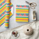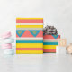 Inspiration is a funky pattern in yellow, pink, blue and white colourful stripes and blue, yellow triangles.
