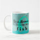 Inspirational mermaid mug for her- Cute saying for teens. Stylish black lettering reads 'Be a Mermaid in an ocean full of fish'. Background resembles fish scales, mermaid scallops pattern in turquoise and faux metallic gold glitter. An aqua mermaid fish tail splashes out of the teal waves that resembles chalk. Note: All images are printed. Not actual metallic glitter or chalk. Wouldn't that be a mess in the dishwasher? Unique gift idea for girls graduation, or for anyone who needs self-confidence. Cute beach decor for a nautical theme kitchen or beach house. We have this words of wisdom quote on other mermaid gifts, as well as lots of other motivational gift ideas, too.
