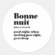 Bonne Nuit. Good Night. Inspirational and motivational French quote design for those who love the beautiful and romantic French language. Cool dictionary definition style merchandise mixed with witty sarcasm and light humour. Who says you can't be funny, chic and cool while inspiring others with this insightful words and life sayings. Great souvenir, Christmas gift and birthday present for those who dream of travelling to Paris and fall in love on the Eiffel Tower.