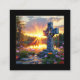 A beautiful religious scene with a stone statue of a holy cross by a scenic lake at sunset.