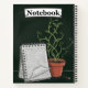 A hardcover notebook with the chalkboard style cartoon drawing of a journal, and a potted vine plant.