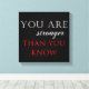 Remind yourself or a loved one 'You are stronger than you know' with this bold motivational canvas print. Hang it on the wall where you can't miss it. Display it for others to see. Stay motivated. Stay strong. Join the revolution. Get inspired. Be an inspiration. Follow Revolution Inspire's blog at www.revoinspire.wordpress.com.