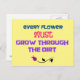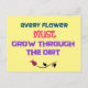 Typography design with an inspirational motivational quote which says " every flower must grow through the dirt. Set on a pale yellow background. A single red rose illustration sits at the bottom.