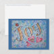 The golden yellow word "Joy" sparkles outlined in silver glitter. Below "Joy" are three pink hearts with a purple outline. The background contains soft blue, green, and lavendar tones. The painting was rendered in watercolor. Glass glitter sprinkled on top to add to the happy feeling of joy from the inspirational word painting.
