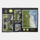 Pictured in a composition are golfing images balls and logos